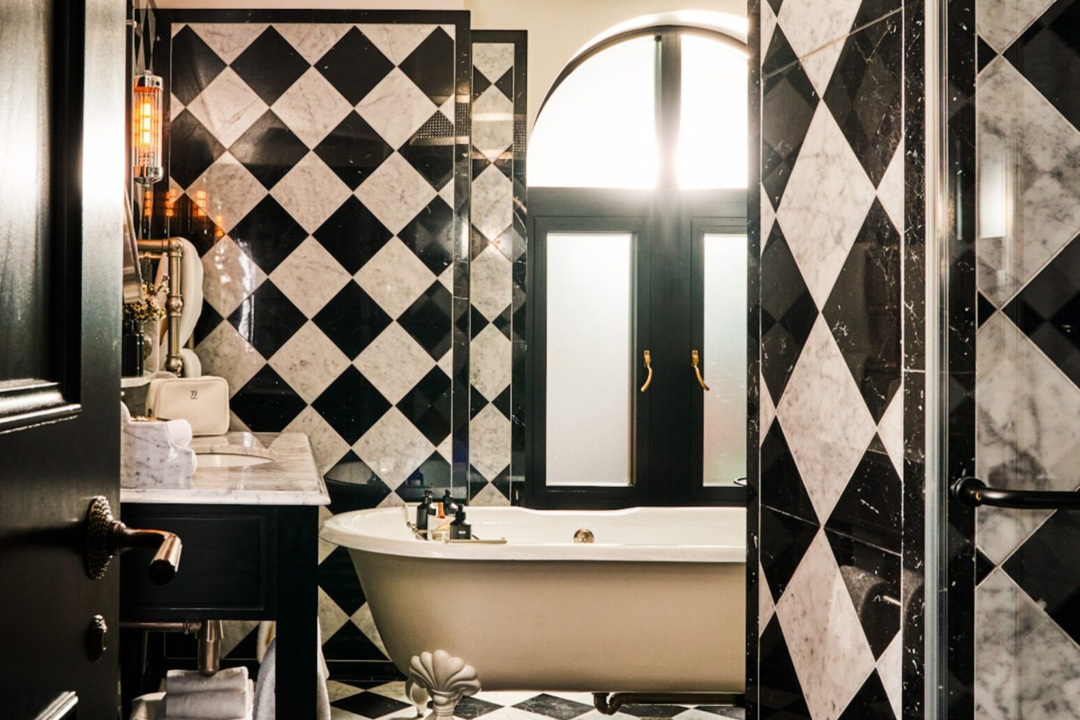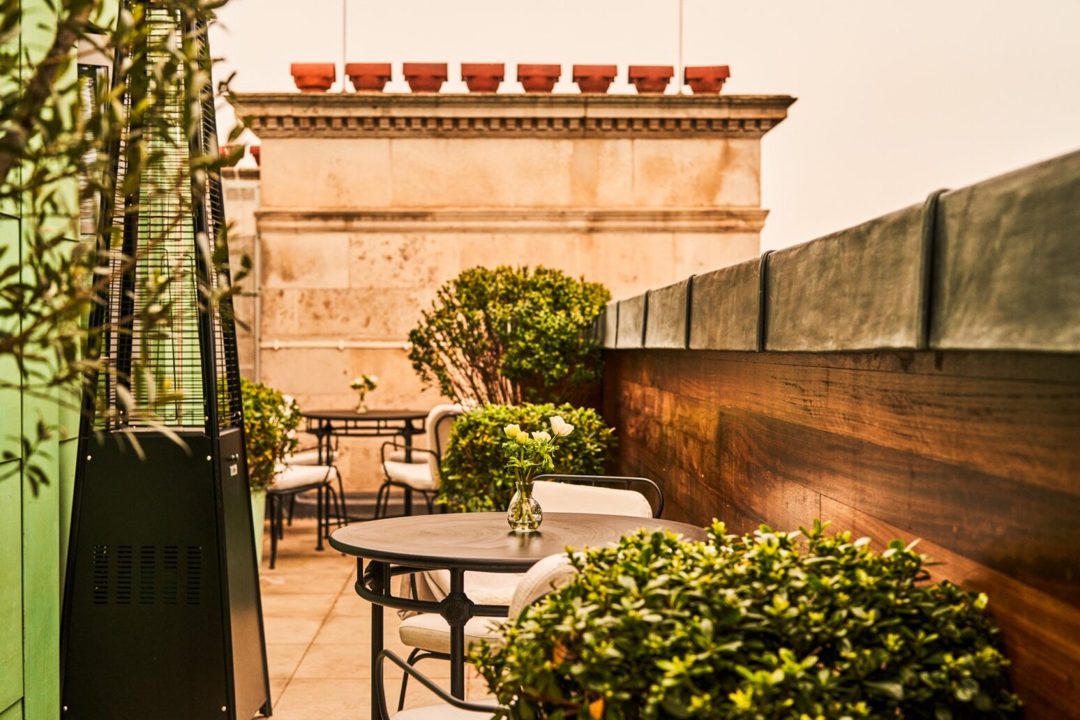 Our exceptional Terrace Suite on the fifth floor boasts private access to a copper-clad 50 ft long terrace with views across Mayfair — perfect for morning yoga or a nightcap under the stars. The living space is richly decorated in red velvet from floor to ceiling and leads to a lavish king sized bed. Its elegant black and white Cabochon bathroom features a double vanity and standalone clawfoot tub.
